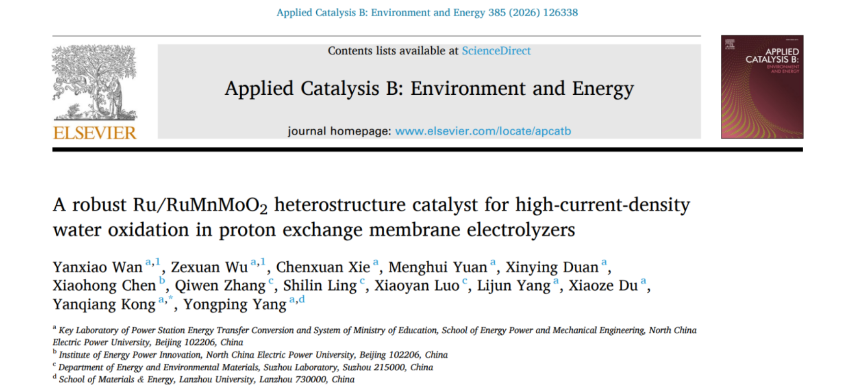 近日,华北电力大学孔艳强副教授在《Applied Catalysis B: Environment and Energy》期刊在线发表了题为“A robust Ru/RuMnMoO2 heterostructure catalyst for high-current-density water oxidation in proton exchange membrane electrolyzers”的研究论文,华北电力大学为论文第一完成单位,能源动力与机械工程学院硕士研究生万延笑、博士研究生吴泽轩为第一作者,孔艳强为通讯作者。该研究工作得到了国家自然科学基金的资助。